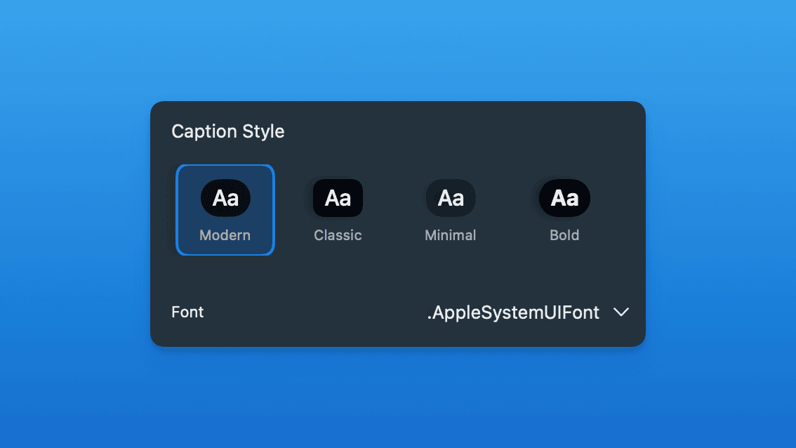 Instantly switch between presets likeModern,Classic,Minimal, orBold, as well as custom fonts, integrating subtitles perfectly into your video design.