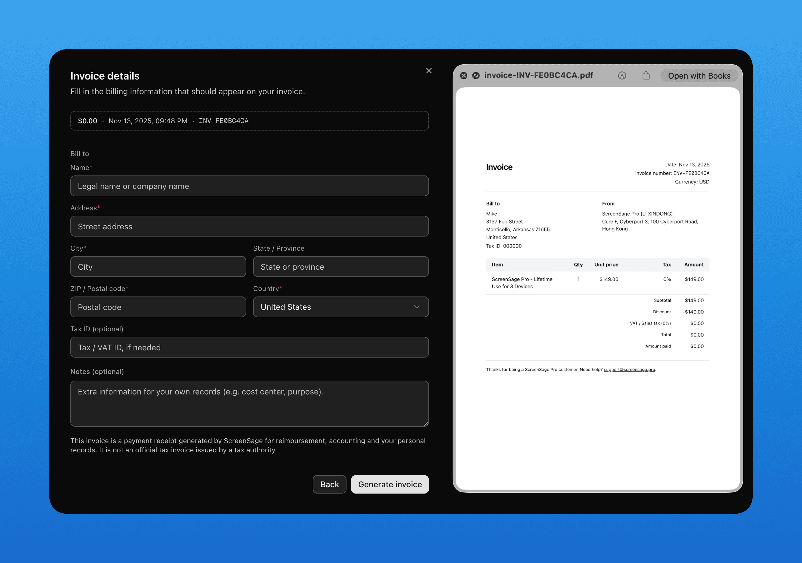 Click the Generate Invoice button. Fill in required details like billing name, and download your electronic invoice.