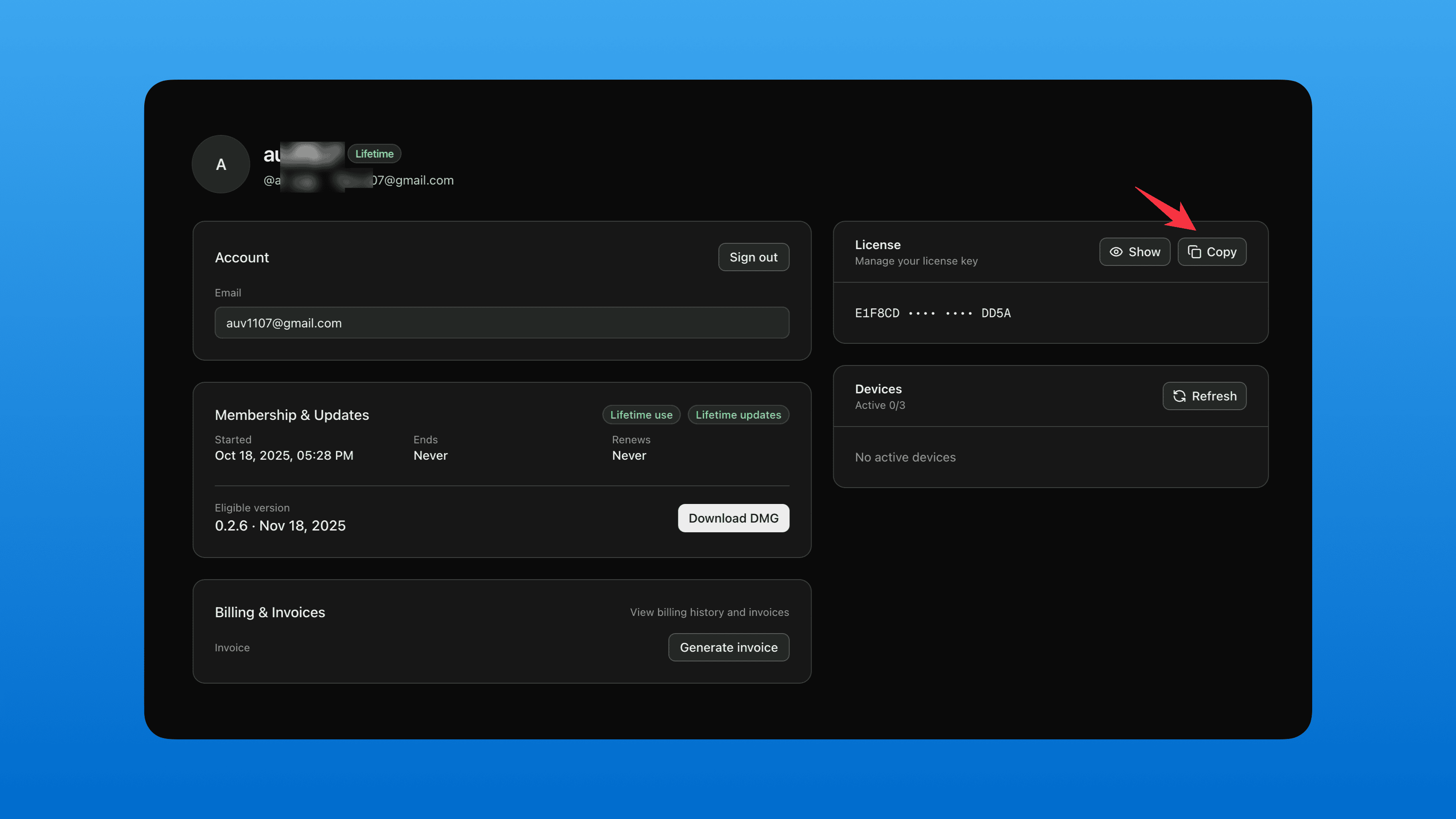 Log in to dash.screensage.pro with your purchase email and copy your license key