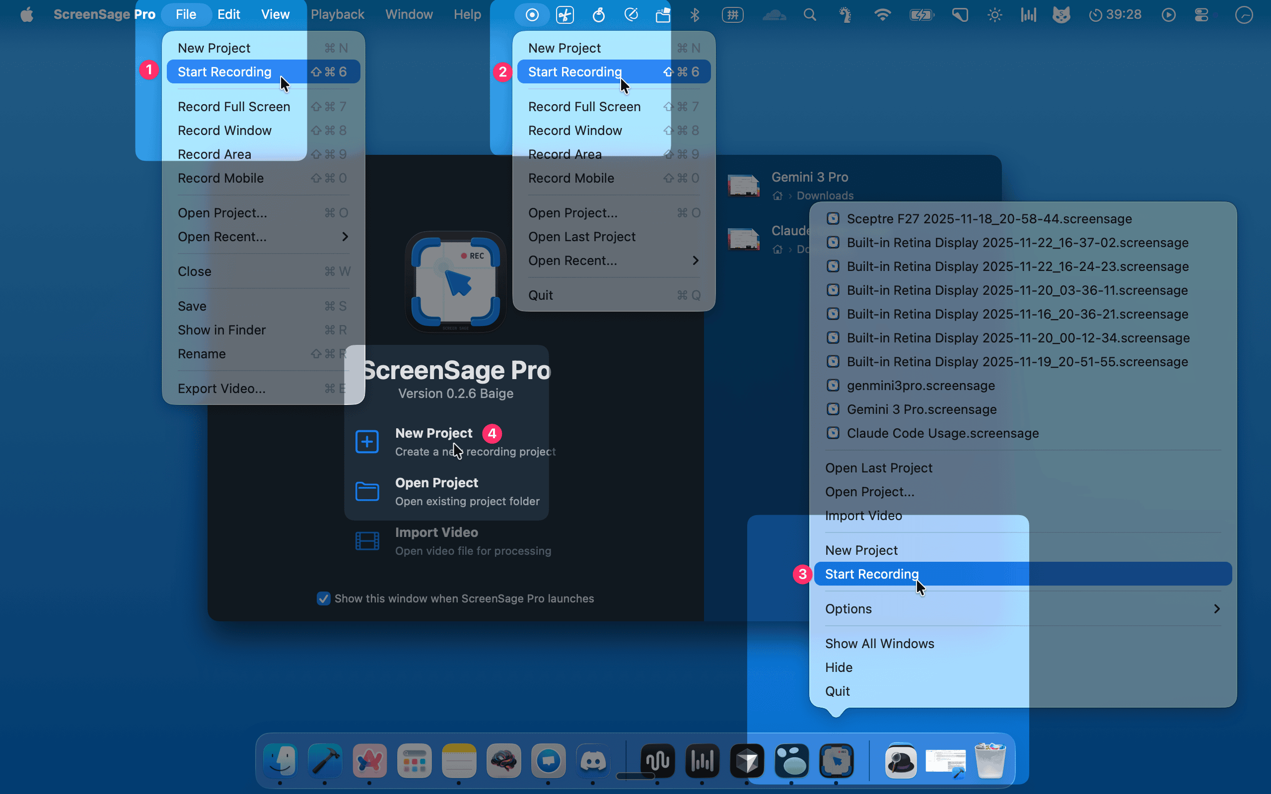 In ScreenSage Pro, quickly start a new recording via the floating Recording Options Panel using ⌘+⇧+6.